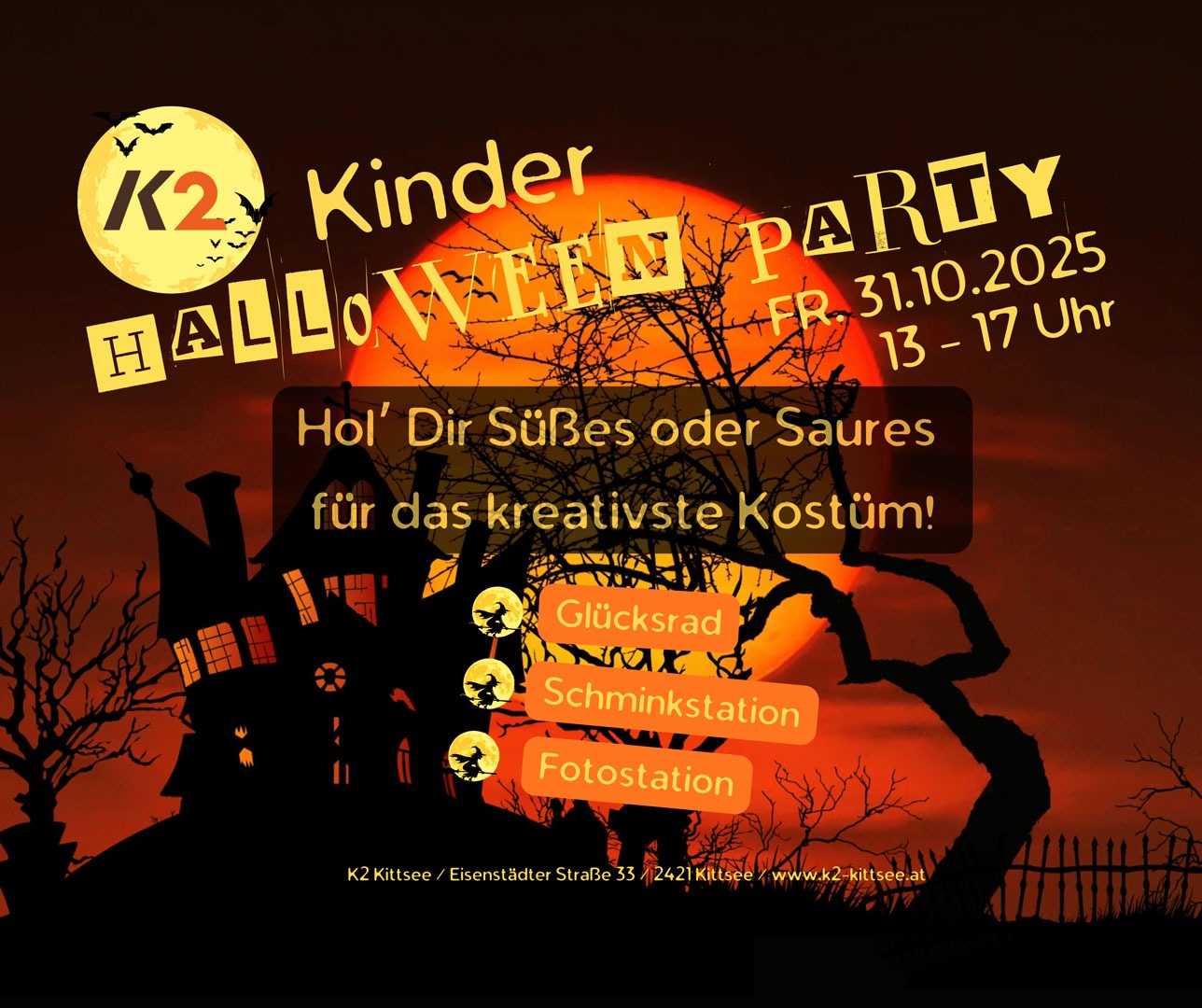 Hol’ dir Süßes oder Saures für das kreativste Kostüm! Glücksrad – Schminkstation – Fotostation.