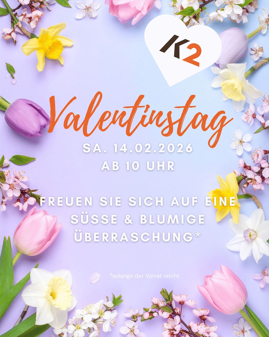 Ein bisschen können wir den Frühling schon erahnen! Im K2 Kittsee gibt es die ersten Frühlingsboten am Samstag, 12. Feber 2022 und anlässlich des bevorstehenden Valentinstags als kleines Dankeschön für Sie!